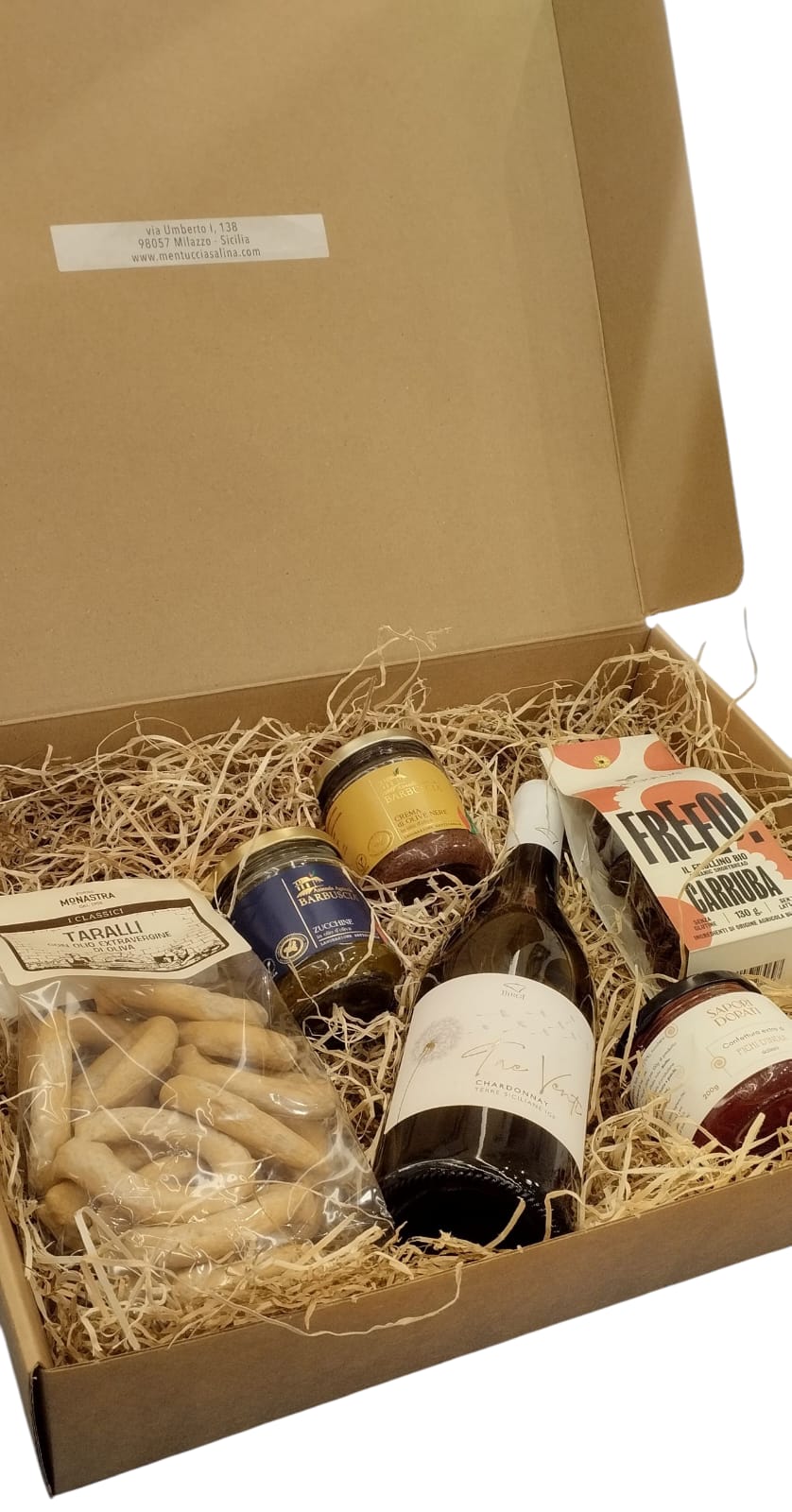 La nostra box gastronomica "Abbinata" comprende 5 specialità artigianali e 1 bottiglia di Chardonnay Terre Siciliane I.G.P.