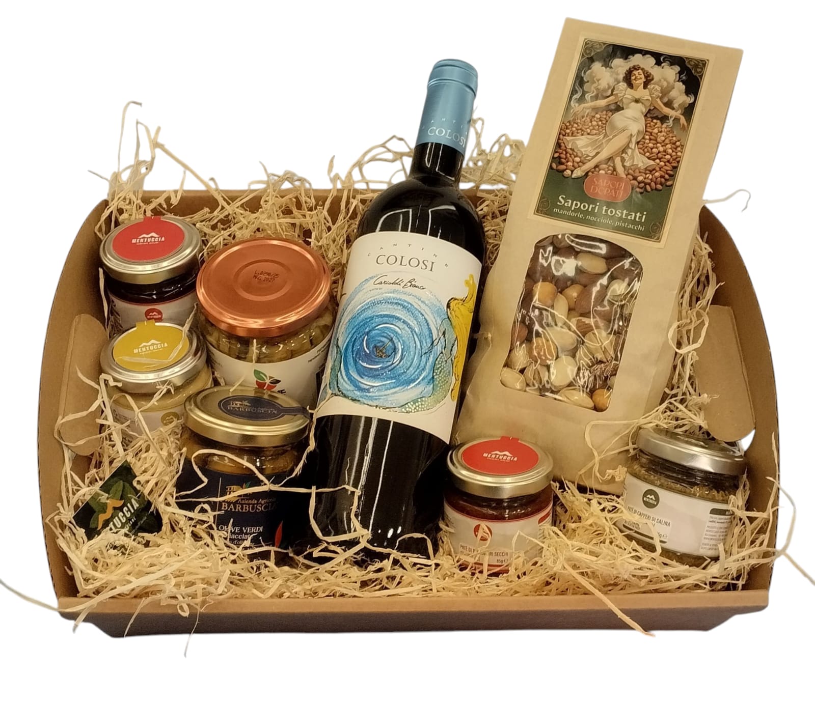 La nostra box gastronomica "Aperitivo per 4" comprende 8 specialità artigianali e 1 bottiglia di vino.
