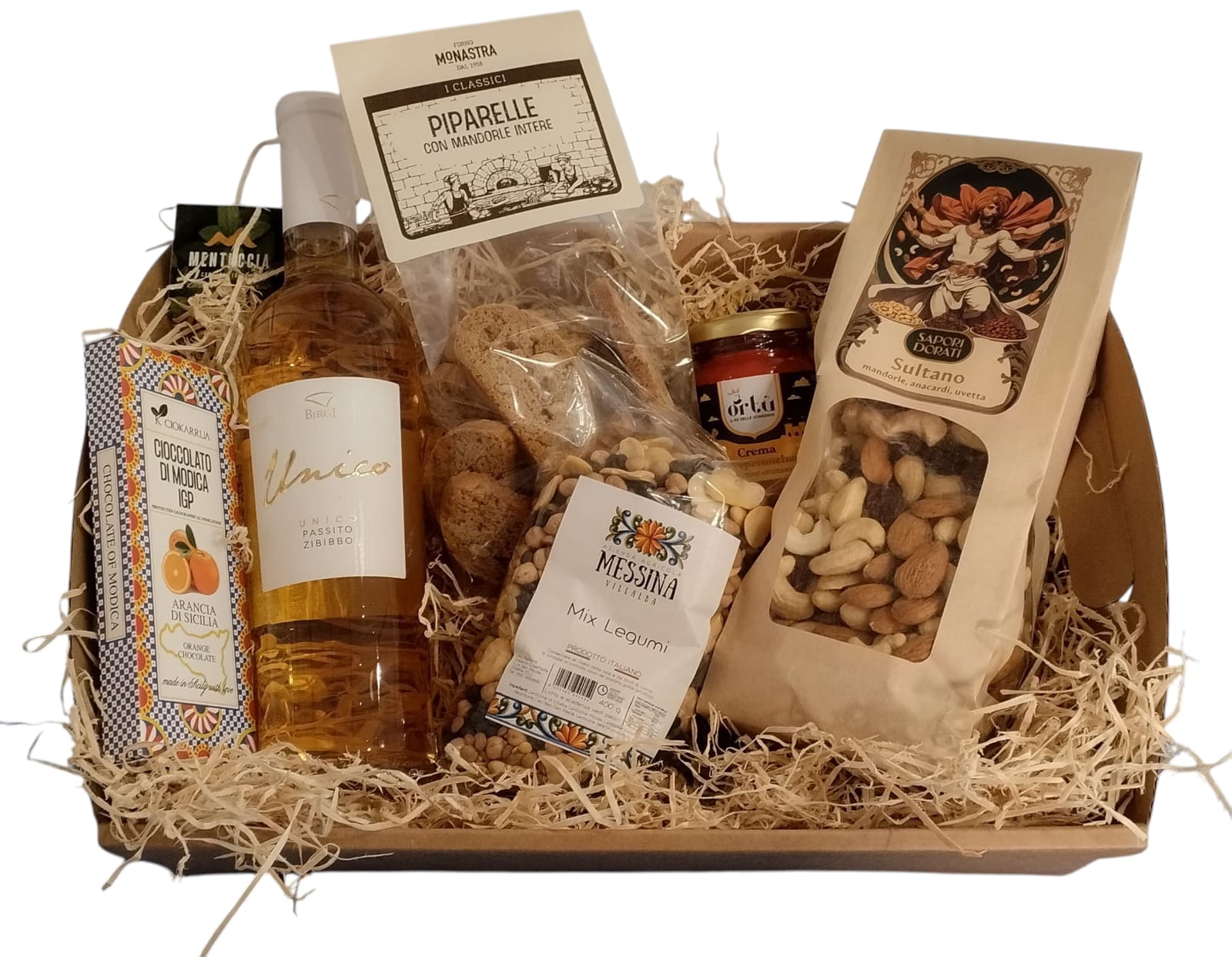 La nostra box gastronomica "Buone Feste" comprende 5 specialità artigianali e 1 bottiglia di Passito Zibibbo IGP.