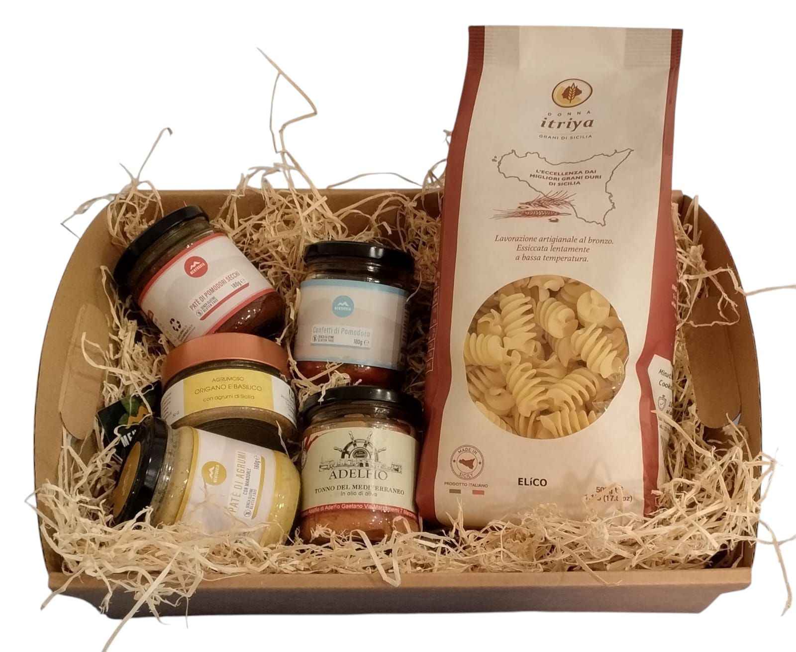 La nostra box gastronomica "Cena per 4" comprende 5 specialità artigianali e 1 confezione di pasta di grani Siciliani.
