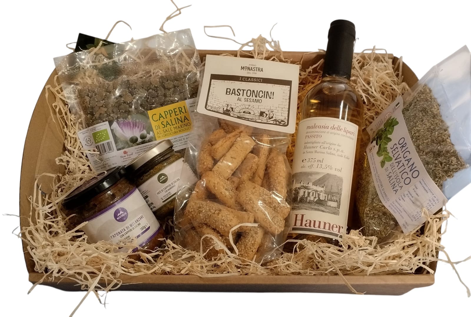 La nostra box gastronomica "Salina" comprende 5 specialità artigianali e 1 bottiglia di Malvasia Passito DOC.