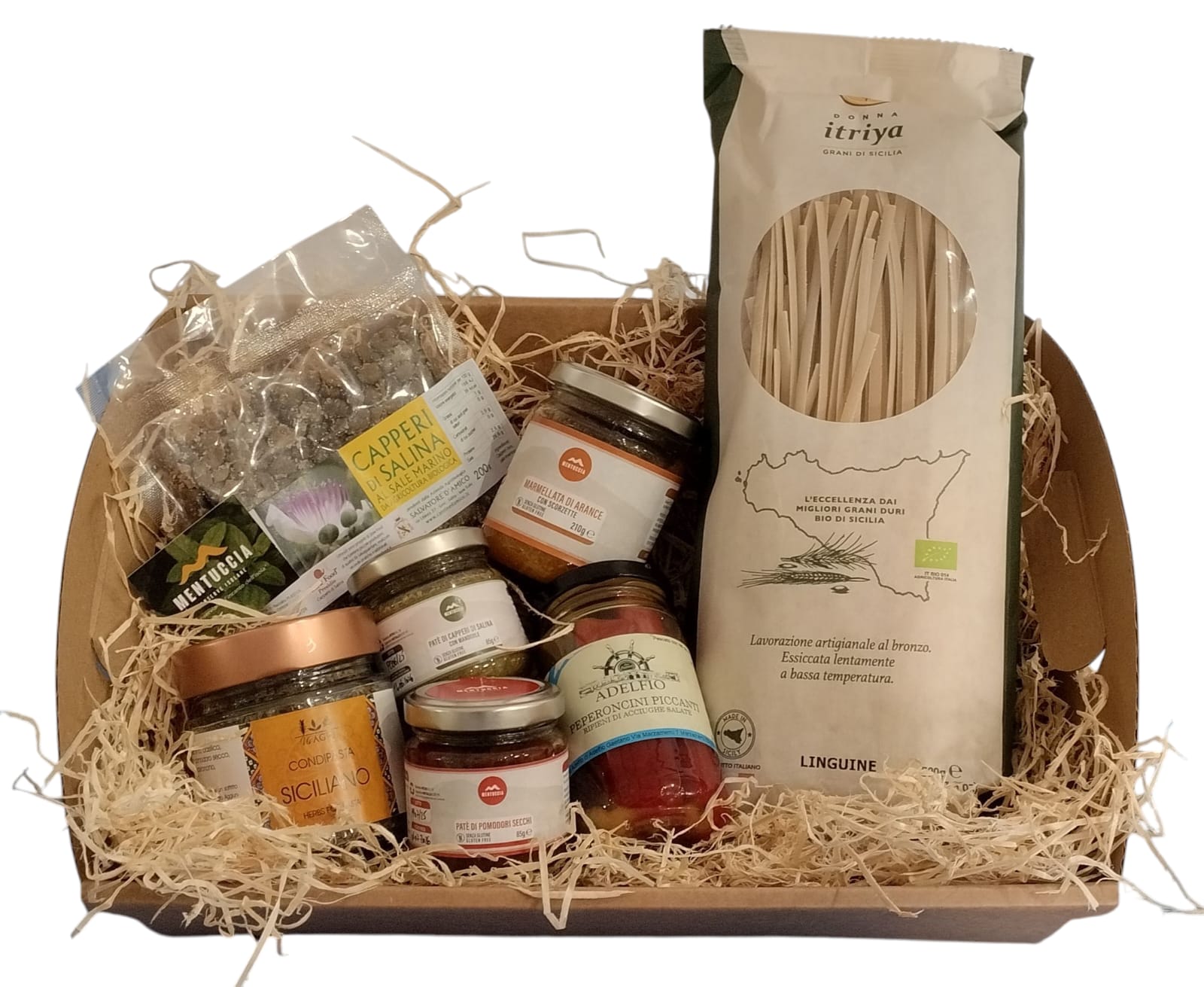 La nostra box gastronomica "Vado a Vivere da Solo" comprende 6 specialità artigianali e 1 confezione di pasta di grani Siciliani bio.
